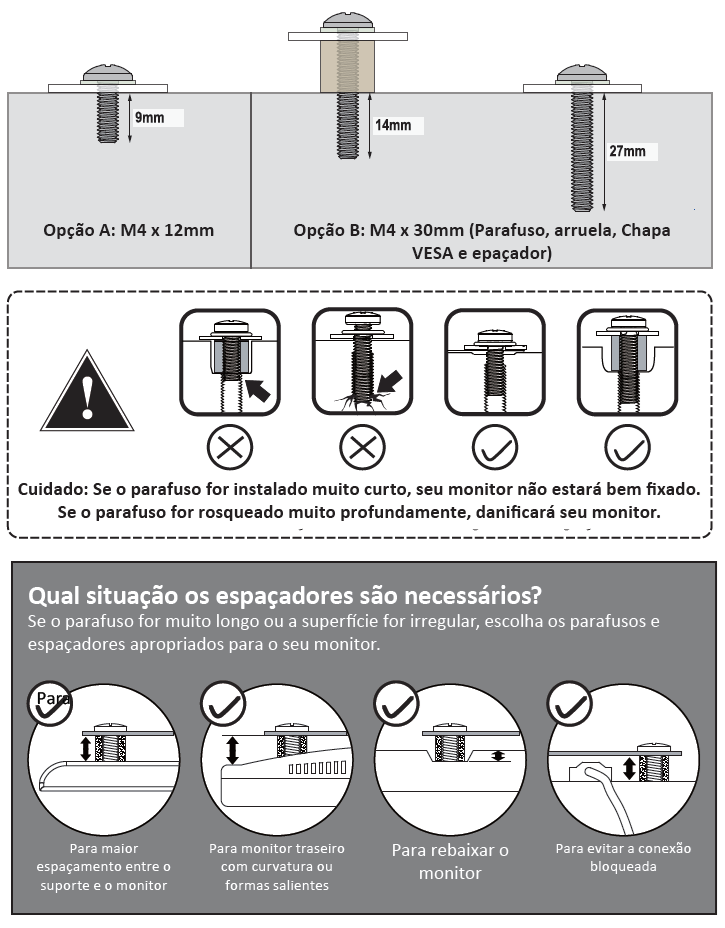 Veja abaixo algumas dicas para escolher o parafuso ideal para sua TV / Monitor e em quais situações utilizar espaçadores ou arruelas.